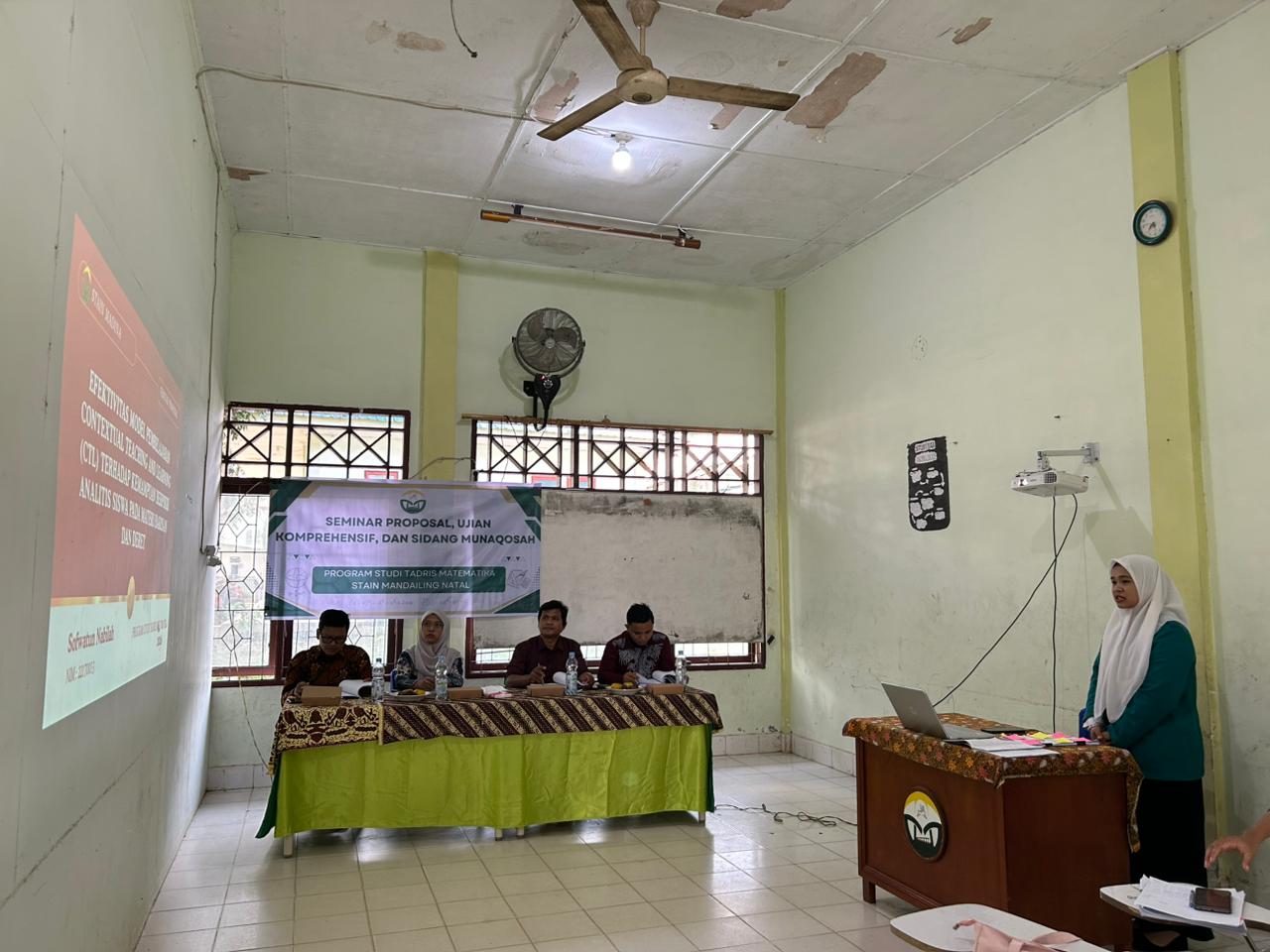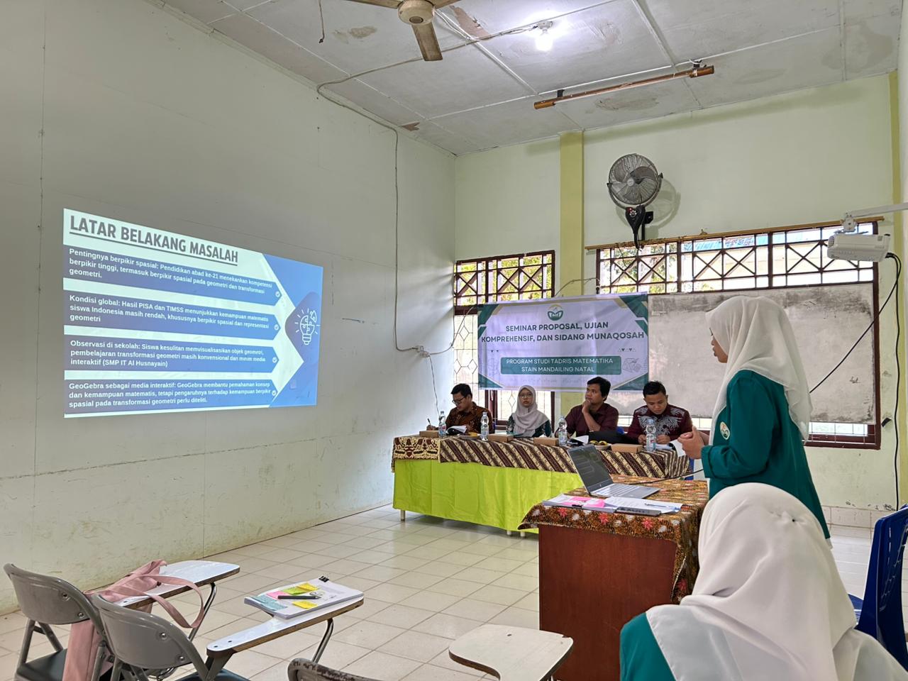 Sempro pertama disampaikan oleh Nisma Hayati dengan judul “Pengaruh Penggunaan Aplikasi Geogebra Terhadap Kemampuan Berfikir Spasial Siswa SMP Pada Materi Transformasi Geometri”. Selanjutnya proposal skripsi kedua disampaikan oleh Sofwatun Nabila berjudul “Efektivitas Model Pembelajaran Contextual Teaching and Learning (CTL) Terhadap Kemampuan Berfikir Analitis Siswa Pada Materi Barisan dan Deret”. Terakhir, proposal skripsi dipresentasikan oleh Mislaini berjudul “Efektivitas Penerapan Project Based Learning (PjBL) Untuk Meningkatkan Pemahaman Siswa dalam Menentukan Luas Permukaan dan Volume Tabung di SMAN 3 Panyabungan”.
