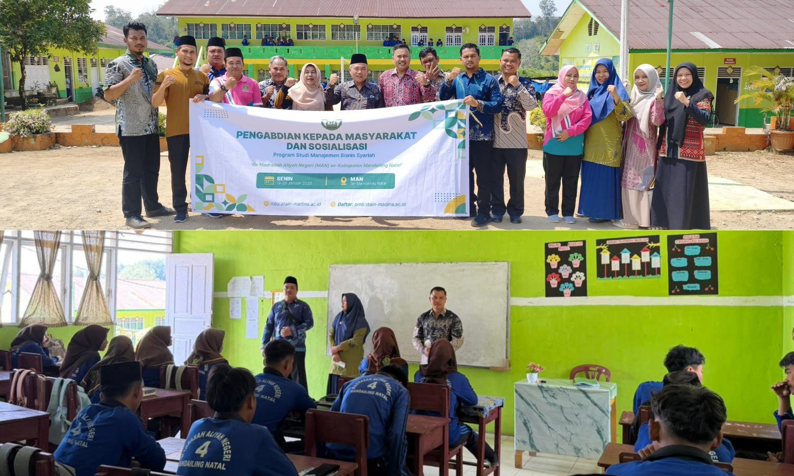 Kedatangan Rombongan Dosen Manajemen Bisnis Syariah disambut antusias oleh pihak sekolah, guru, serta para siswa kelas akhir. Dalam kegiatan tersebut, para dosen memberikan pemaparan terkait pengenalan STAIN Mandailing Natal, program studi Manajemen Bisnis Syariah, peluang studi lanjut, serta prospek karier lulusan di bidang ekonomi dan bisnis berbasis syariah.