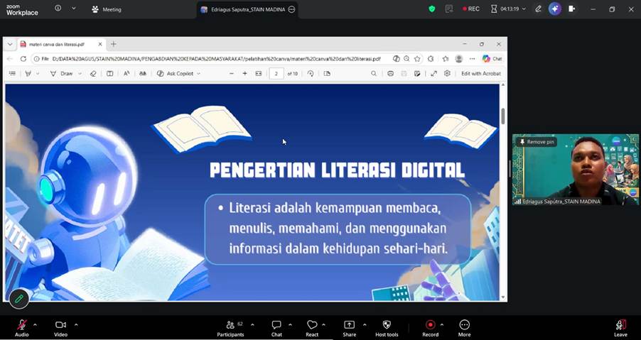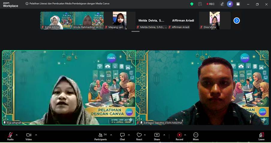 Pemateri pertama, Edriagus Saputra, S.Th.I., M.Ag, dosen STAIN Mandailing Natal, mengangkat tema “Peran Literasi dan Media Canva dalam Pembuatan Media Pembelajaran yang Menarik”. Ia menekankan pentingnya integrasi literasi digital dalam proses pembelajaran serta pemanfaatan Canva sebagai solusi praktis dalam menciptakan media ajar yang interaktif.