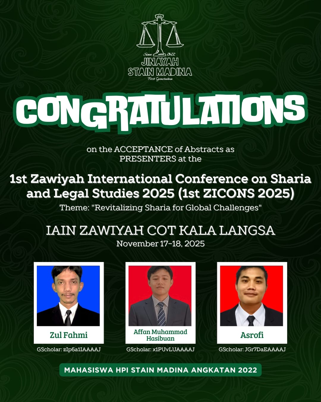Panyabungan - Tiga mahasiswa Program Studi Hukum Pidana Islam STAIN Mandailing Natal berhasil lolos seleksi abstrak dan akan tampil sebagai presenter pada 1st Zawiyah International Conference on Sharia and Legal Studies 2025 (1st ZICONS 2025). Ketiganya adalah Zul Fahmi, Affan Muhammad Hasibuan, dan Asrofi, yang dinyatakan lolos abstrak pada 13 November 2025 dan dijadwalkan mempresentasikan makalah pada 17 November 2025 di IAIN Zawiyah Cot Kala Langsa, bersama-sama dengan lebih dari 100 dosen, mahasiswa S1 hingga S3 dari berbagai kampus nasional hingga manca negara lainnya yang lolos, seperti dari Malaysia, Nigeria hingga Georgia.