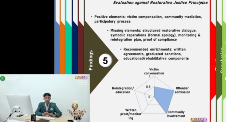 Affan Muhammad Hasibuan dan Asrofi bersama-sama memaparkan karya yang bertajuk “Revitalizing Islamic Legal Values in Judges’ Decisions Against Child Assault Perpetrators: Analysis of Decision Number 17/Pid.Sus-Anak/2024/PN Bks.”Kajiannya berfokus pada bagaimana nilai-nilai hukum Islam dan prinsip perlindungan anak tercermin dalam putusan peradilan anak, serta peluang reformatif untuk memperkuat perlindungan korban melalui pertimbangan hakim yang lebih responsif.