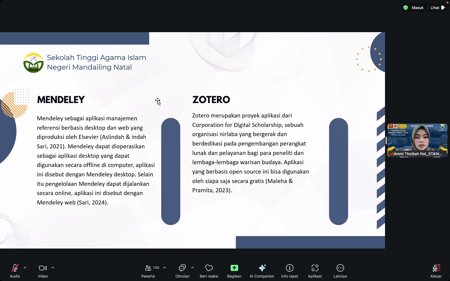 Sesi berikutnya diisi oleh Asrin Nasution, M.Pd., dan Ammi Thoibah Nasution, M.Pd., yang memberikan pelatihan penggunaan aplikasi reference manager, seperti Mendeley dan Zotero. Kedua narasumber menekankan manfaat aplikasi ini dalam mengelola sitasi dan menyusun daftar pustaka secara cepat dan akurat. Para mahasiswa juga mendapat kesempatan melihat demonstrasi langsung aplikasi tersebut untuk memperdalam pemahaman.