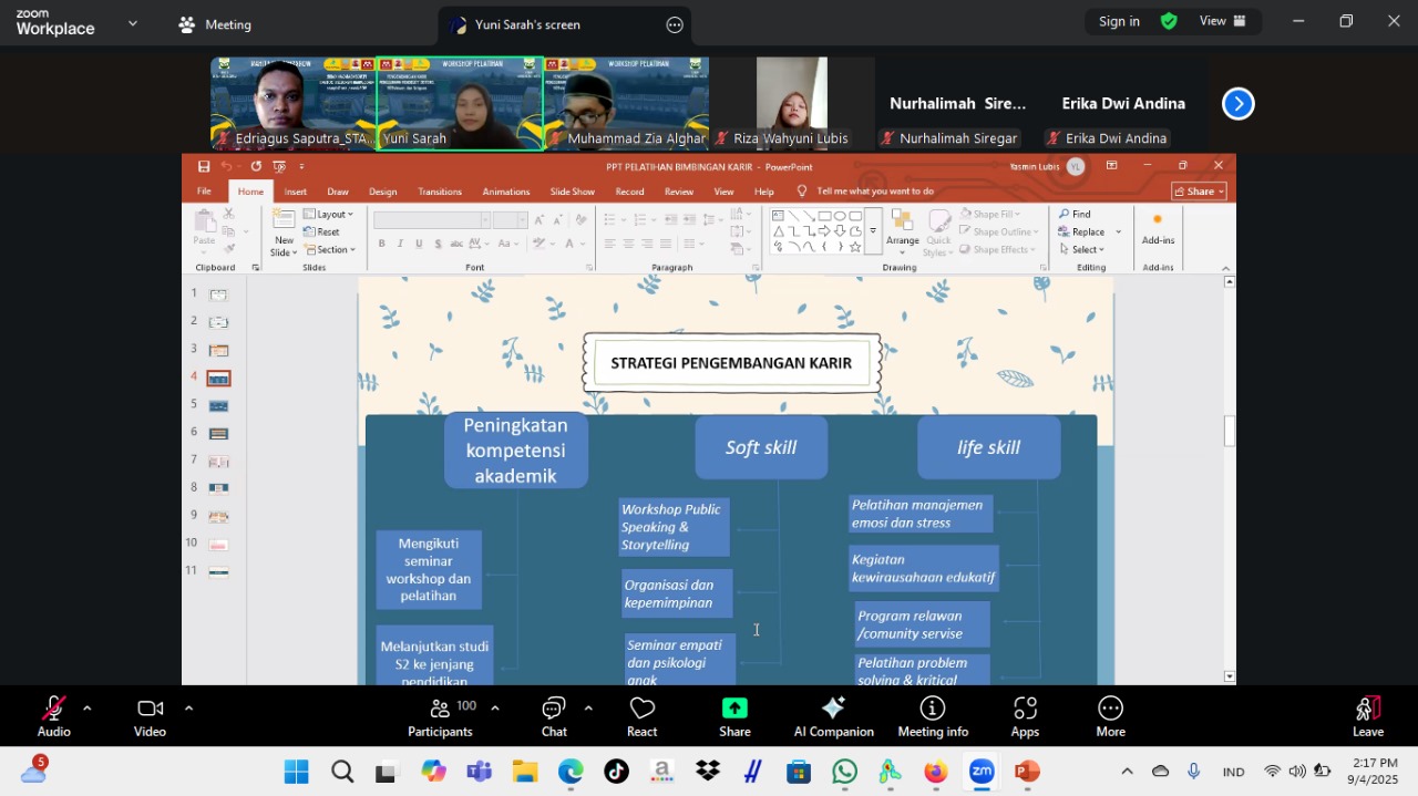 Kegiatan ini diisi oleh serangkaian pemateri dalam tiga sesi. Pada sesi pertama, Yuni Sarah, S.Sos.I., M.Psi. selaku dosen Program Studi PIAUD menyampaikan materi tentang strategi pengembangan karir mahasiswa. Beliau menekankan bahwa literasi akademik tidak hanya terkait kemampuan menulis, tetapi juga menjadi bekal penting dalam menapaki dunia akademik dan profesional. Mahasiswa diajak memahami pentingnya menata karir sejak dini agar lebih siap menghadapi tantangan studi lanjut maupun dunia kerja.