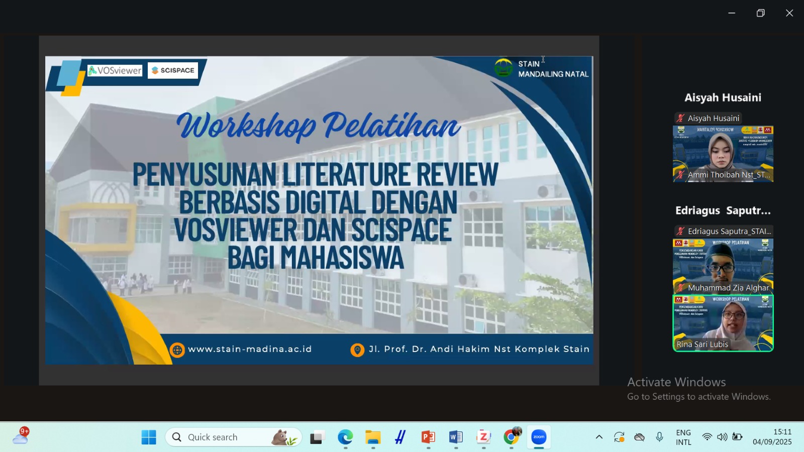 Panyabungan – Sekolah Tinggi Agama Islam Negeri (STAIN) Mandailing Natal menyelenggarakan pelatihan literasi akademik bagi mahasiswa melalui program pengabdian kepada masyarakat, Sabtu (4/9/2025). Kegiatan yang diikuti oleh seratus mahasiswa dari berbagai program studi ini mengangkat tema “Workshop pengembangan karir serta pelatihan penggunaan Mendeley, zotero, VOSViewer, dan Scispace”. Pelatihan berlangsung secara daring melalui Zoom Meeting dan mendapat apresiasi dari Wakil Ketua III STAIN Madina, Dr. H. Kasman, M.A.
